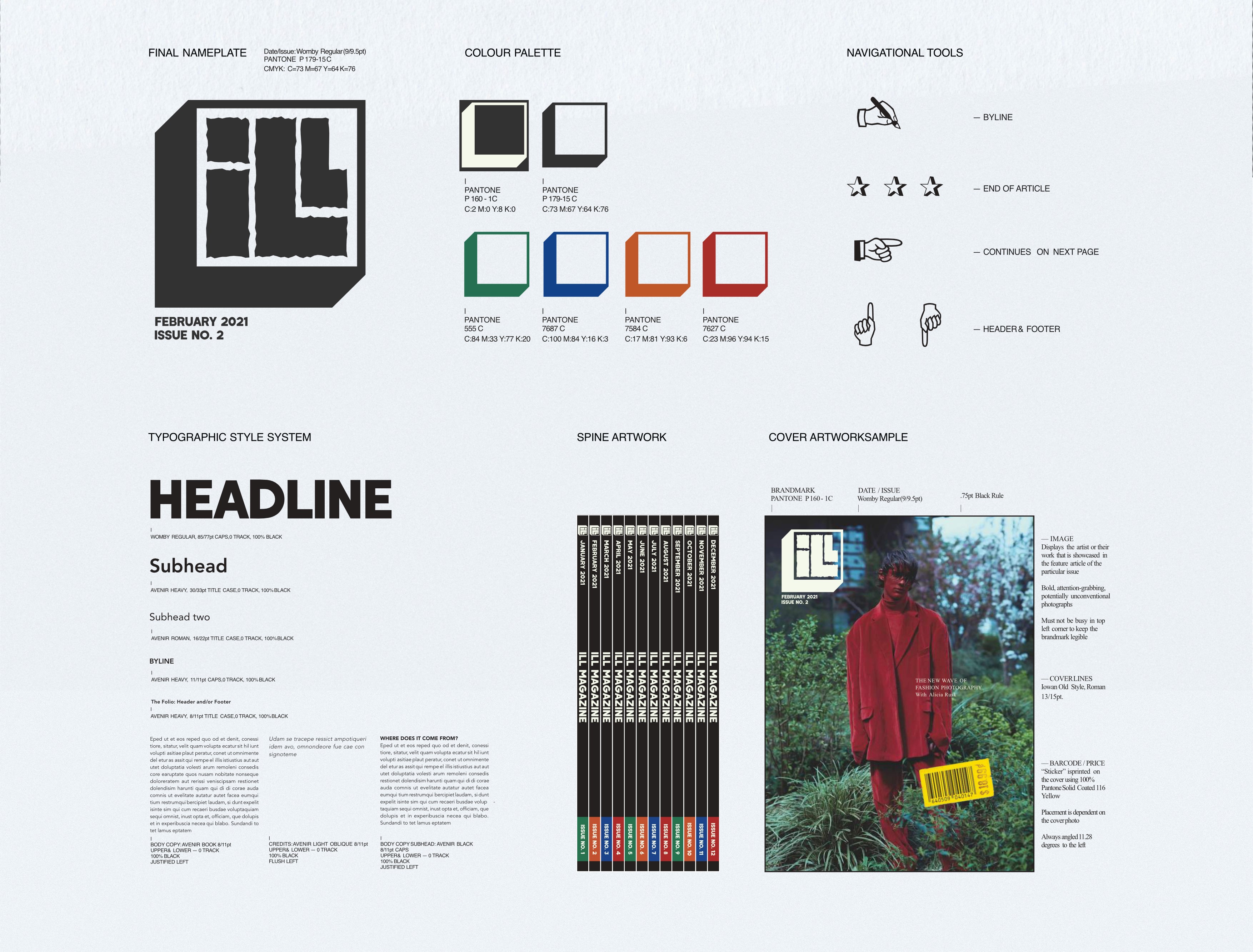 The final result is a bold, modular magazine identity centered around a boxed “ILL” nameplate that acts as both a logo and a graphic device throughout the publication. A colour-coded system organizes the magazine into its four artistic sections, creating clarity while reinforcing the brand’s visual language. The cover designs feature striking, artist-led imagery and a faux printed sticker that can intentionally obscure part of the image, encouraging interaction and curiosity. The overall look is raw, playful, and expressive, capturing the energy of young creative culture and positioning ILL as a platform that celebrates experimentation, individuality, and the voices of emerging artists.