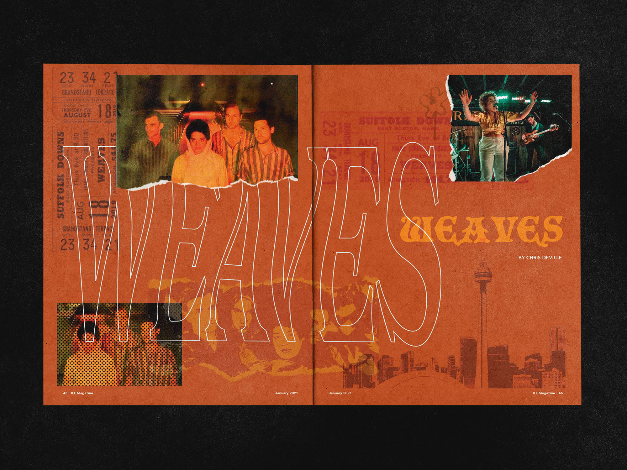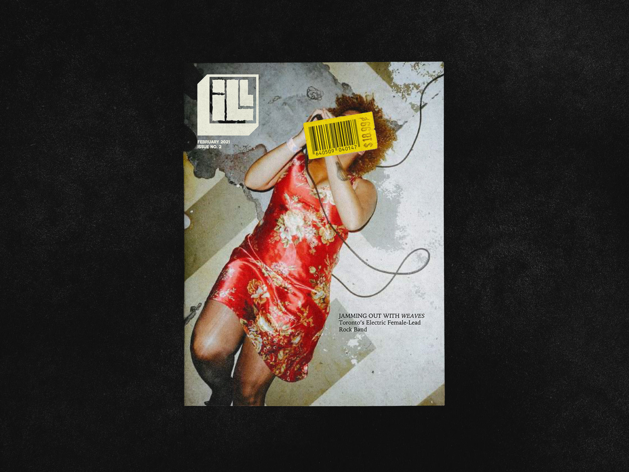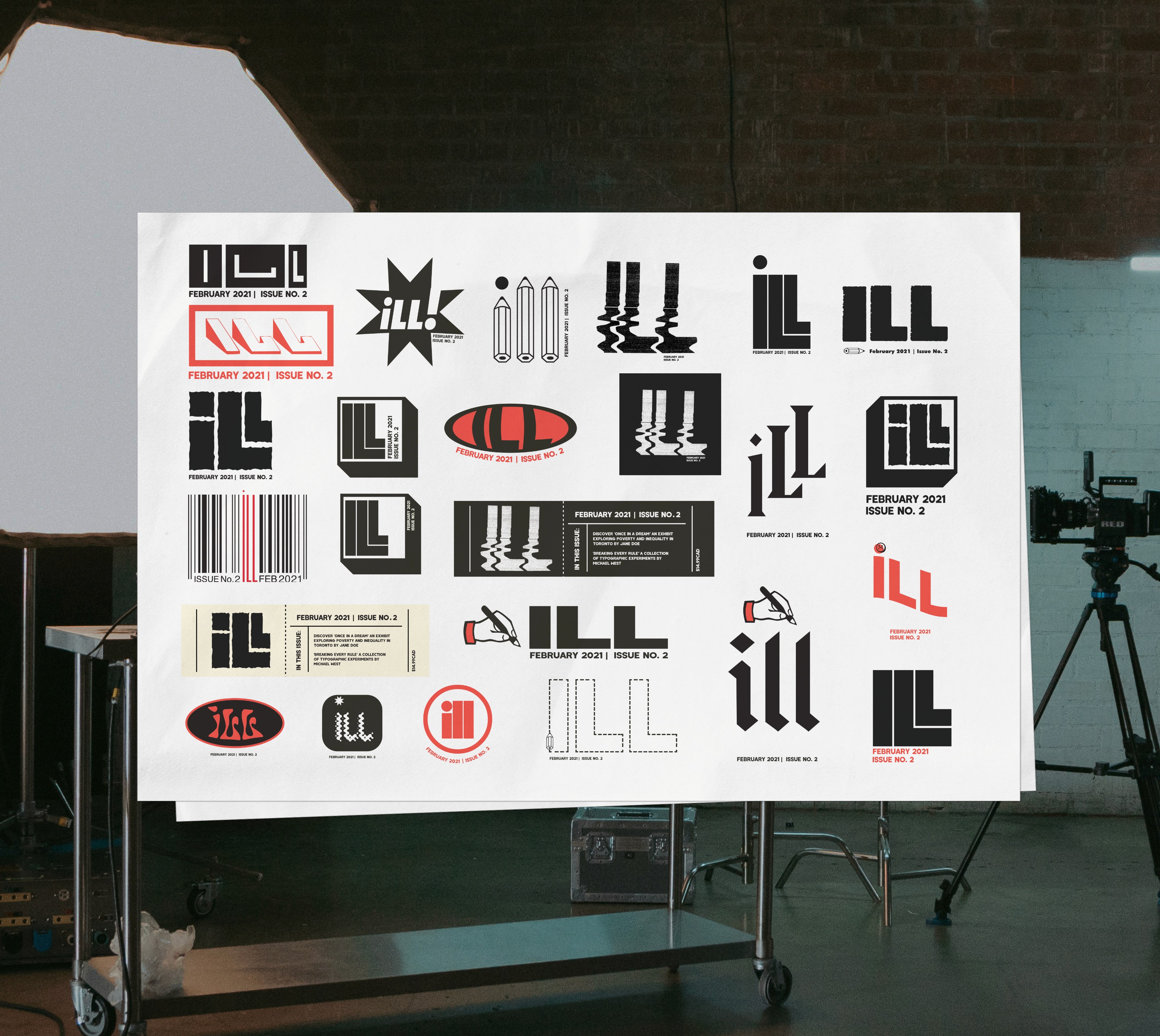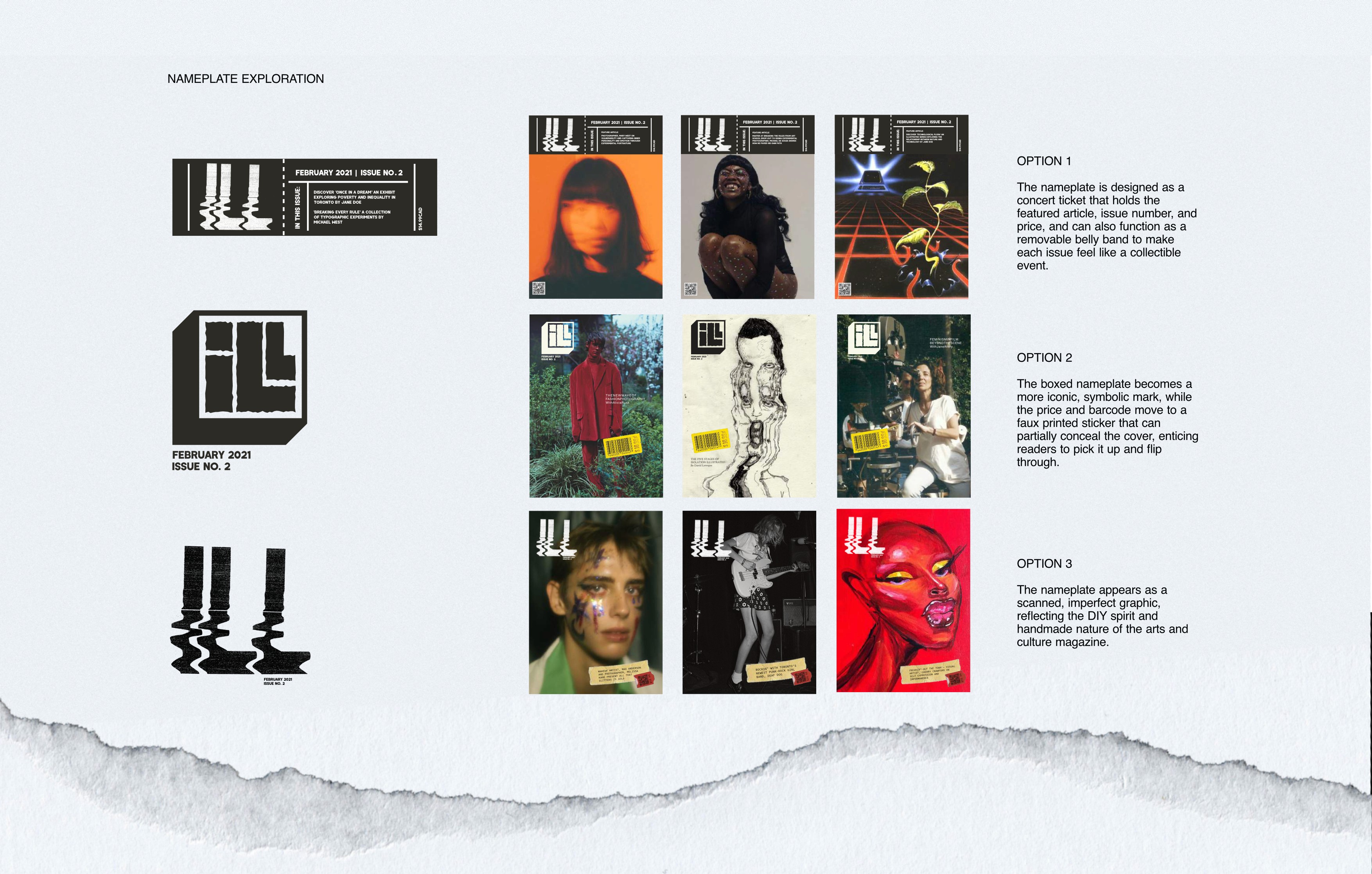 The development of ILL began by defining the audience, tone, and positioning, then moved into exploring the nameplate, cover system, and overall layouts. Multiple directions were tested, including a concert-ticket belly band and distorted typographic treatments to achieve a raw, handmade feel that reflects the magazine’s zine-like, DIY spirit. Cover designs focused on bold, high-energy imagery and a printed “sticker” for the barcode and price, turning a required element into an interactive compositional device that can partially obscure the image and entice readers to flip through. A colour-coded system organizes the four content section: Film & Photography, Literature, Visual Arts, and Music & Audio. The final result is a flexible system that adapts to different artists and mediums while remaining distinctly ILL.