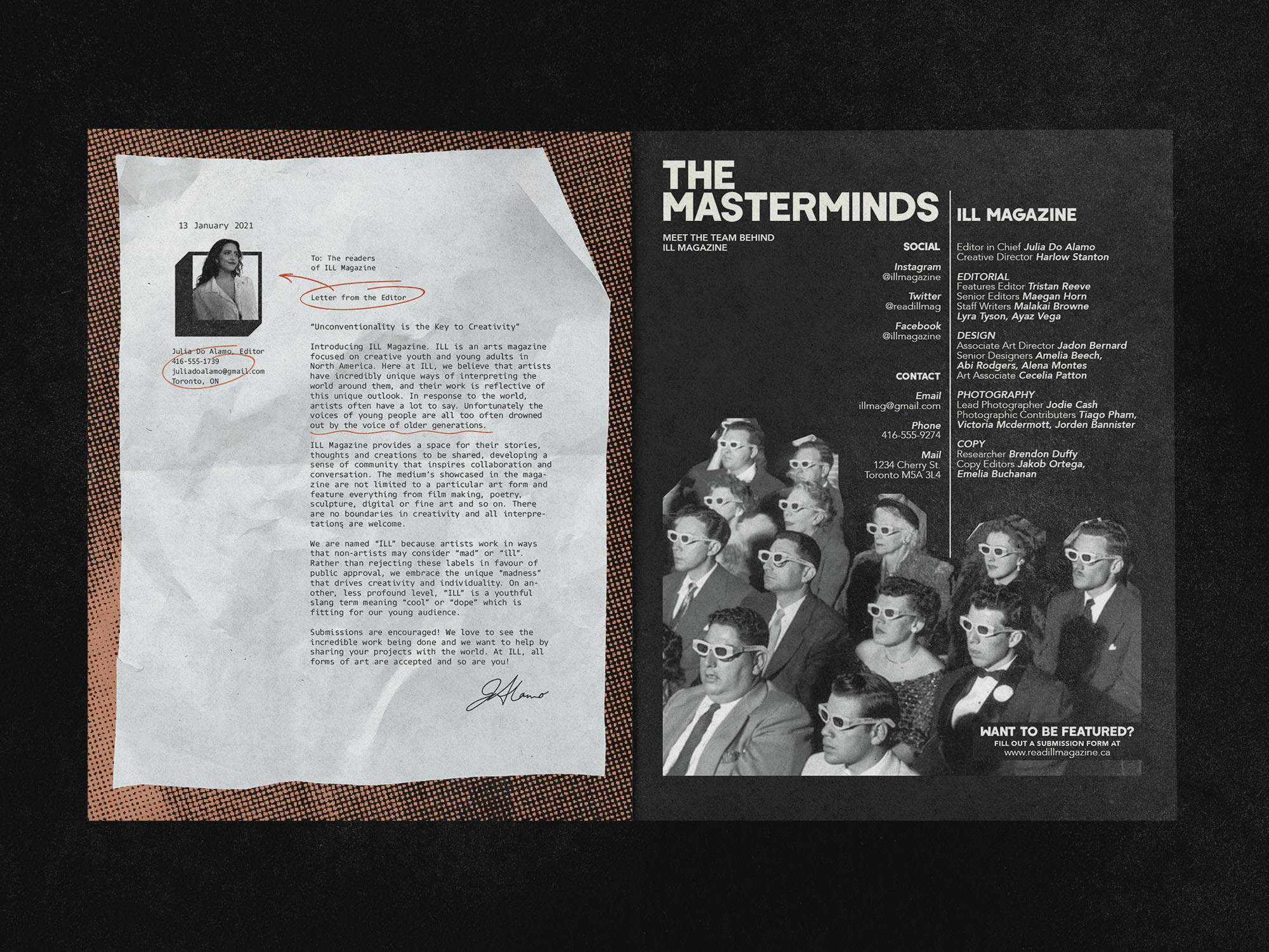 ILL Magazine is a fictional arts & culture magazine for creative youth and young adults in North America. Built around the idea that “unconventionality is the key to creativity,” ILL exists to give emerging artists a platform to share their work, stories, and perspectives in a space that feels bold, inclusive, and unapologetically experimental. The magazine spans four disciplines: Film & Photography, Literature, Visual Arts, and Music & Audio. “ILL” celebrates the unconventional, highlighting the “madness” of artists who think, work, and see the world differently. Visually and conceptually inspired by independent zines and alternative culture, ILL is designed to feel raw, expressive, and community-driven rather than polished or corporate.