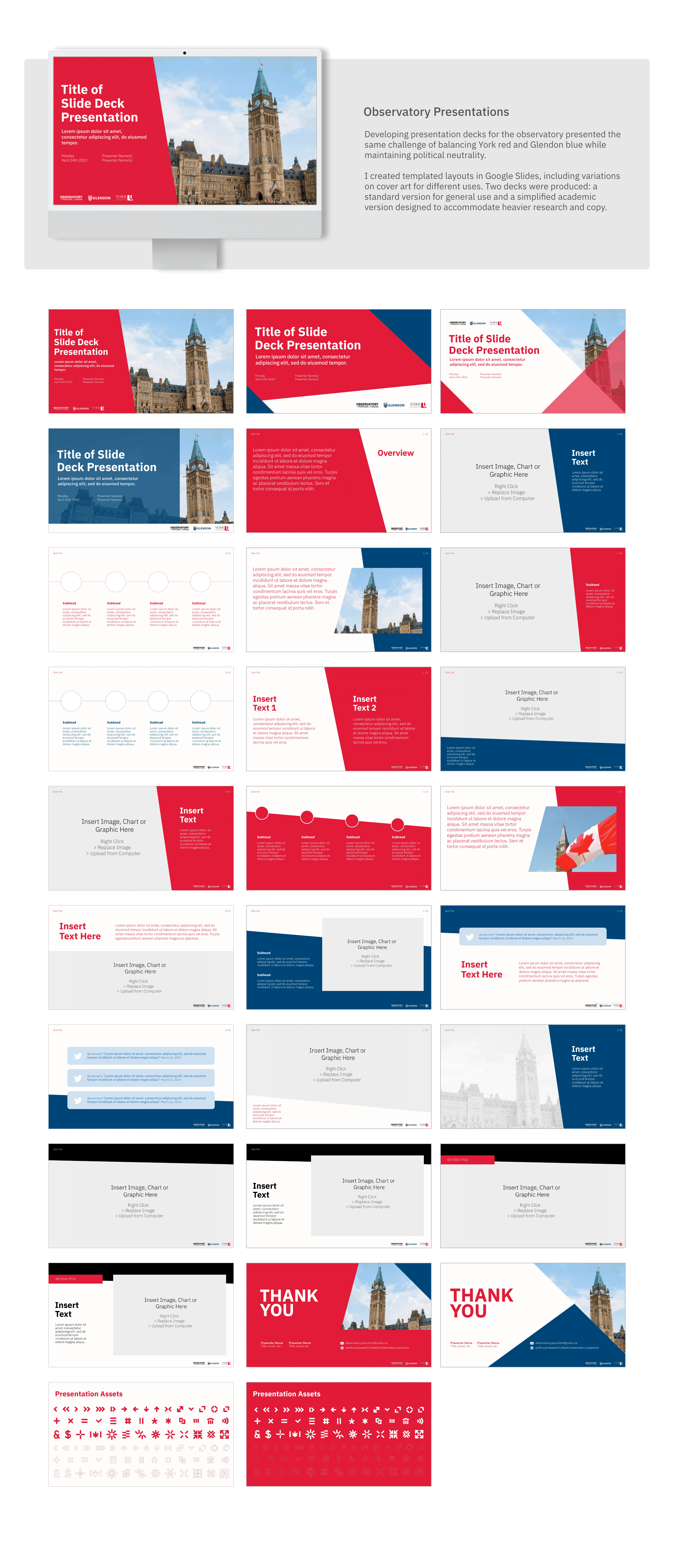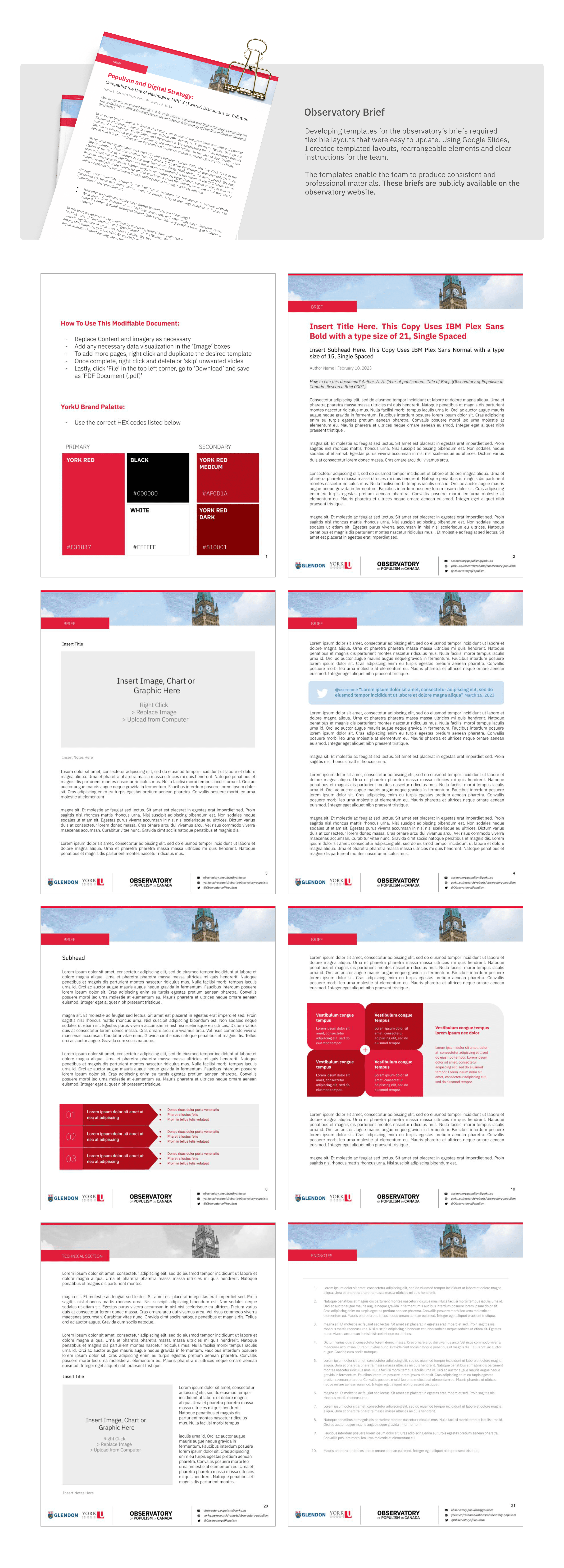 The wordmark, brief templates, and presentation decks provide the observatory with a flexible, templated visual system that stays within York University’s brand guidelines. The team uses these materials regularly and is happy with how easy they are to work with and how consistent the results remain.