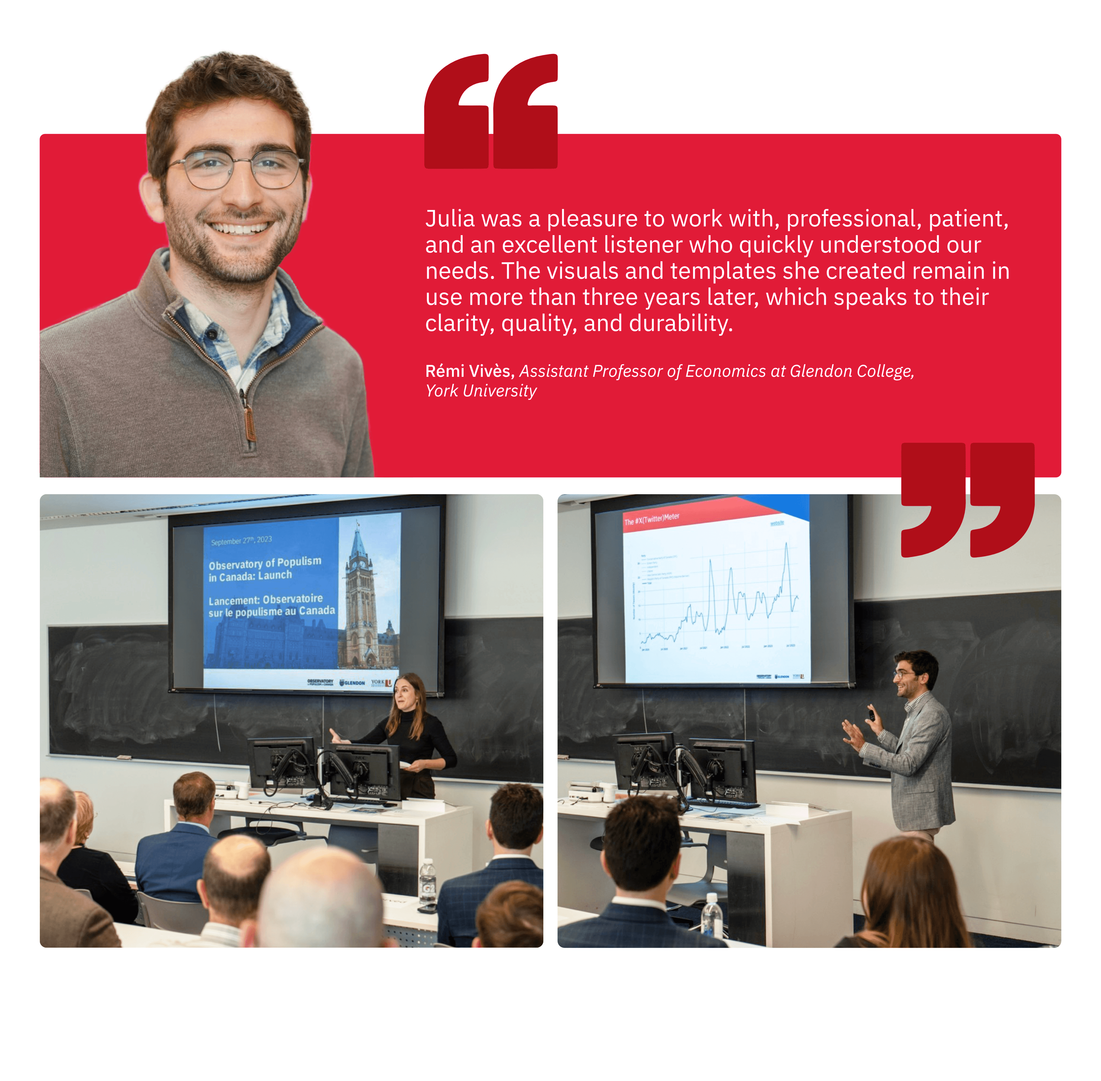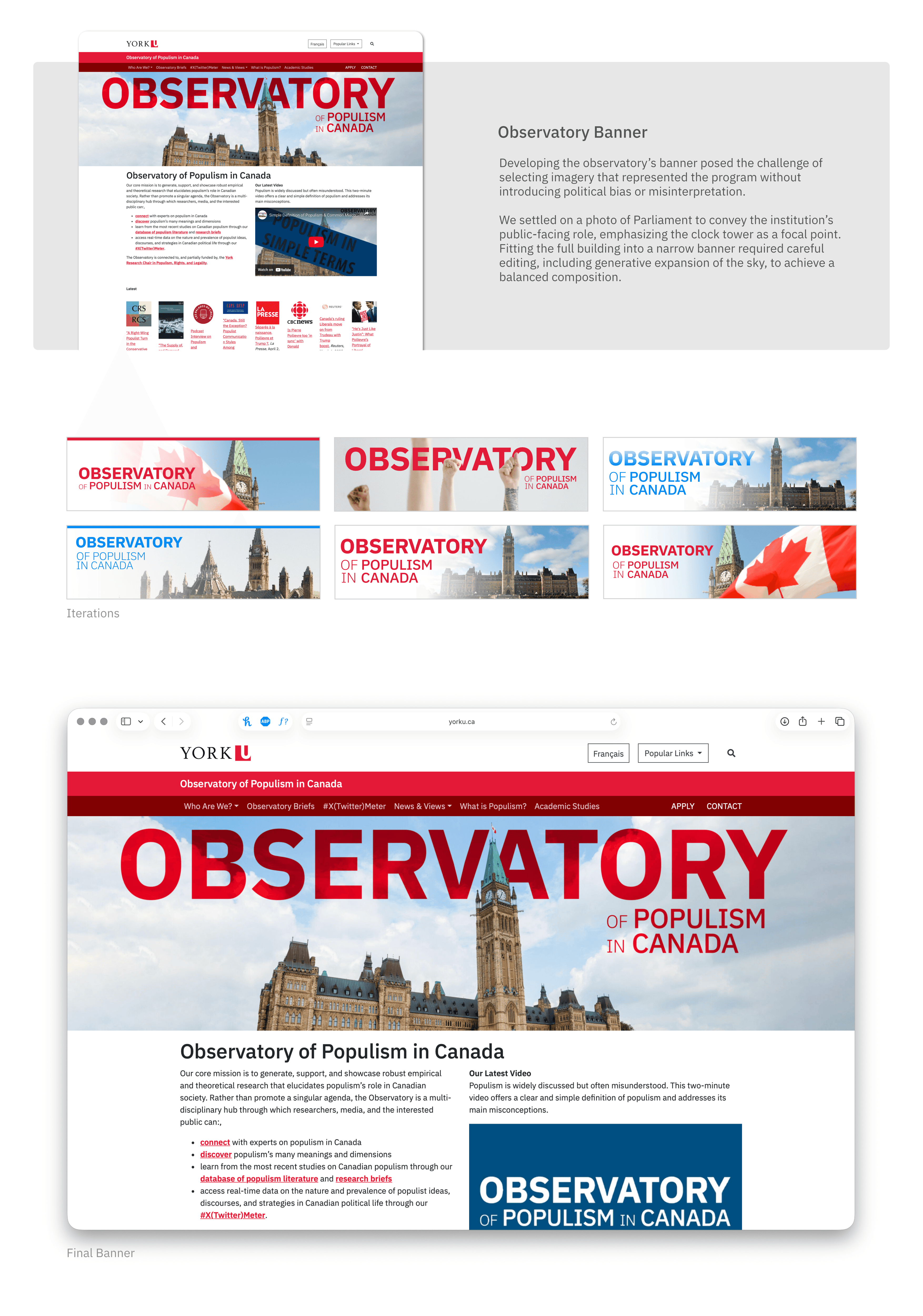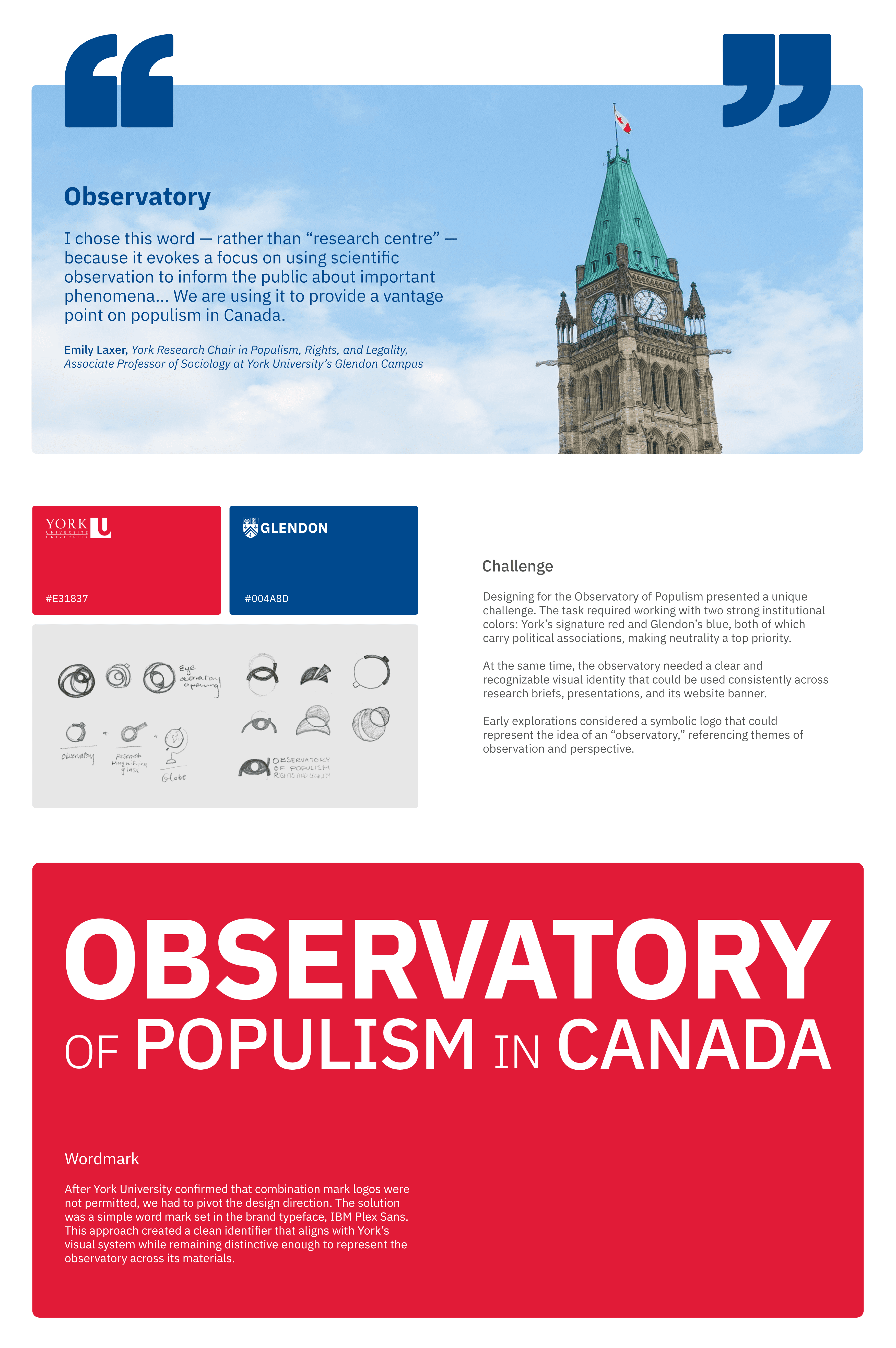 I collaborated with Glendon Campus, York University, to create a visual identity for the Observatory of Populism in Canada, which provides a non-partisan lens on populism, exploring its forms, causes, and effects. The project brief was to design a distinctive word mark, research brief templates, academic presentation decks, and digital assets that clearly identify the observatory while maintaining political neutrality and adhering to York University’s brand guidelines.